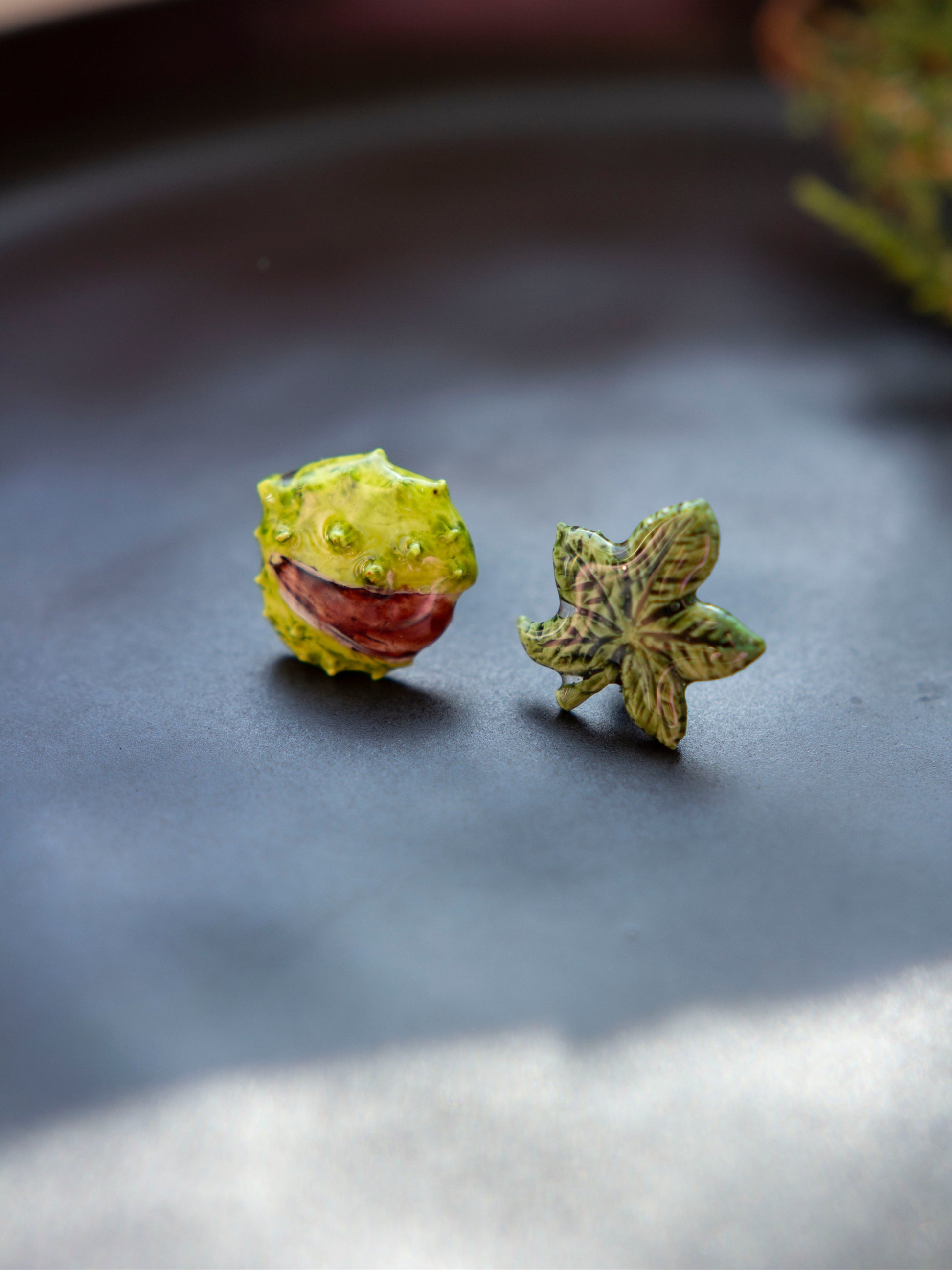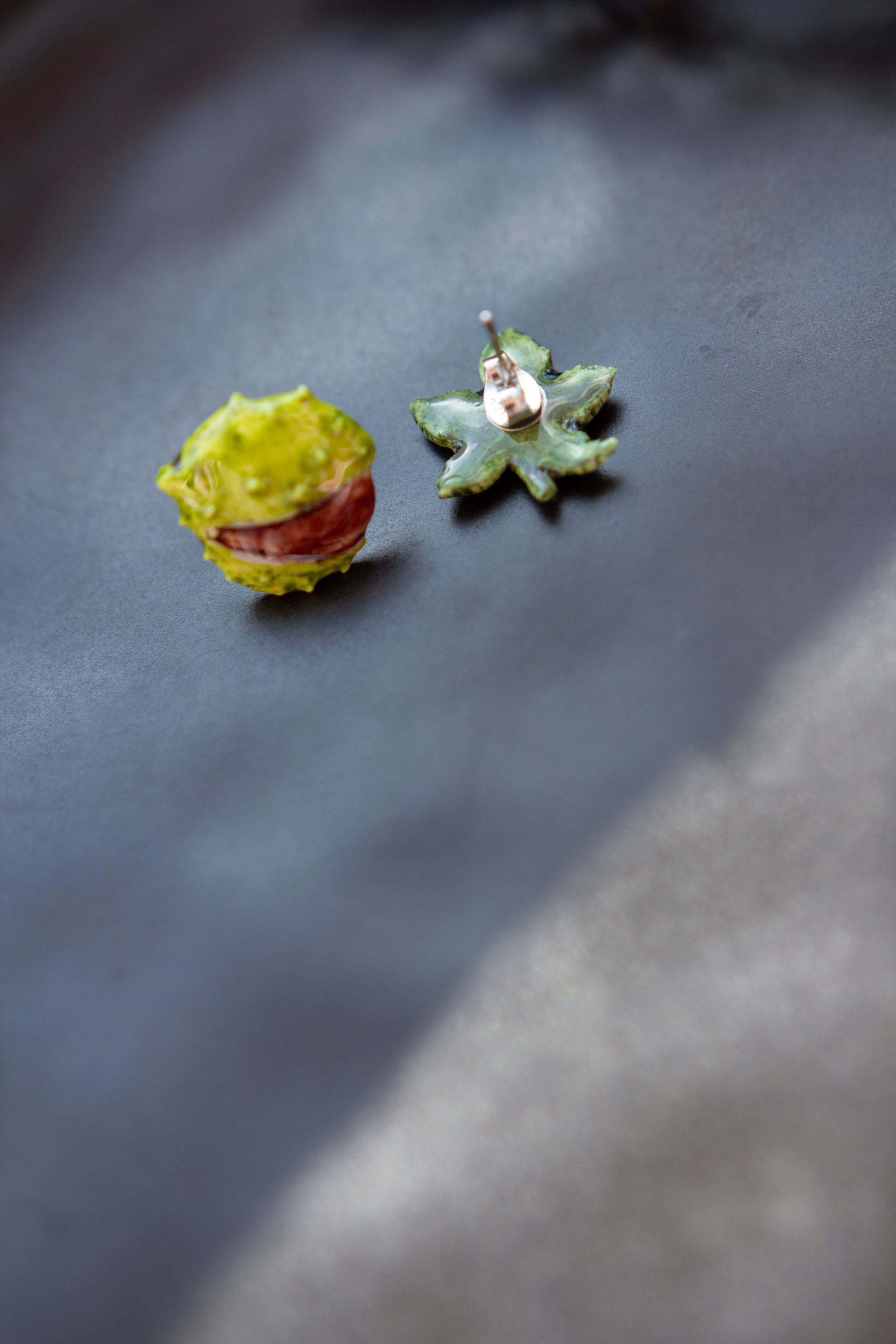 Auskari, kas perfekti iemieso rudens būtību, asimetriski - vienā ausī kastanis, otrā kastaņa lapa = lielākai jautrībai. Lieliski piemēroti, lai piešķirtu mazliet dabas siltuma jebkuram tavam tērpam. Rudens mīļotājiem šie auskari būs īpaši mīļi.