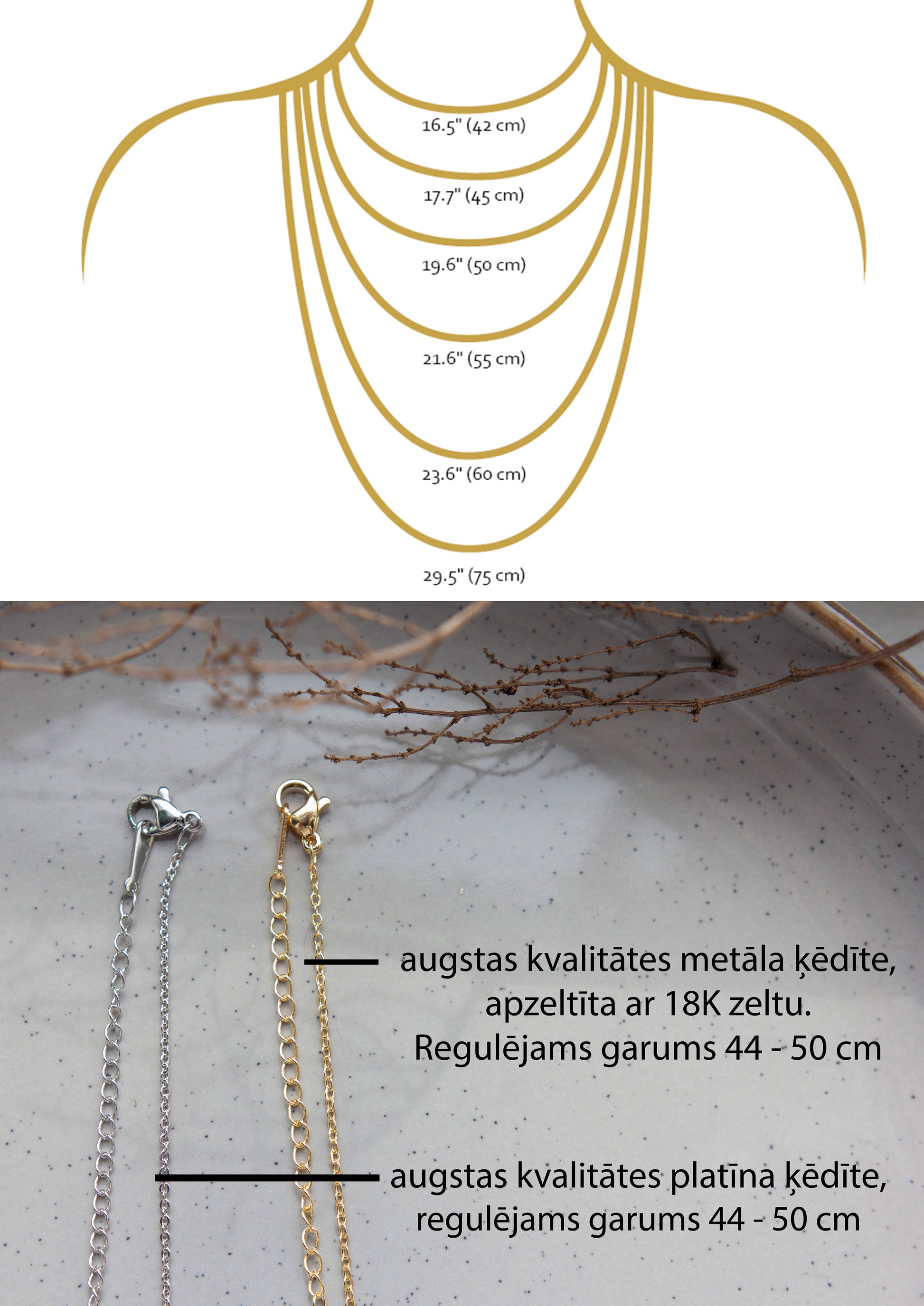 Kulona izmērs: 3,2 x 2,6 cm. Ķēdītes garums: regulējams no 44 - 50 cm.
