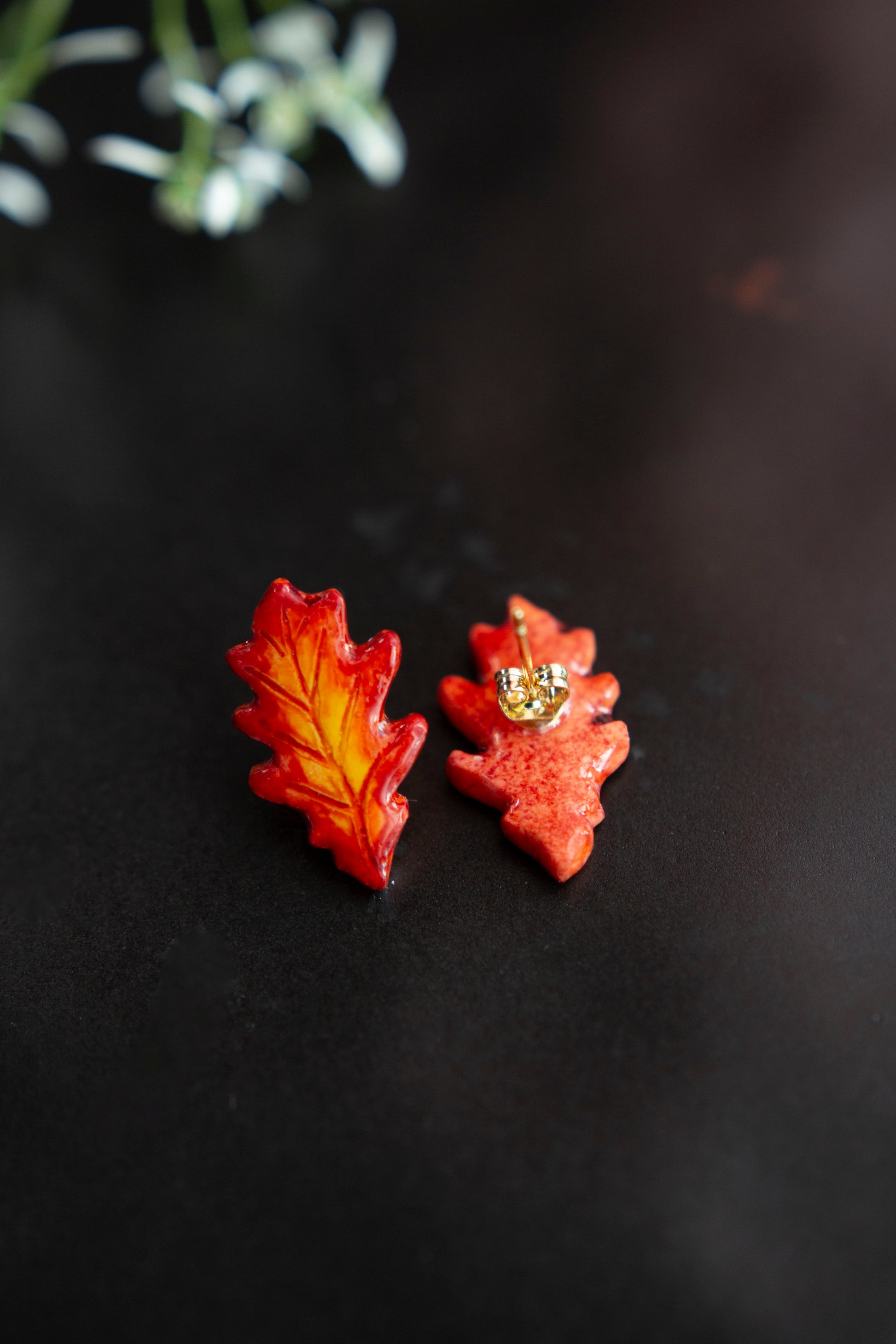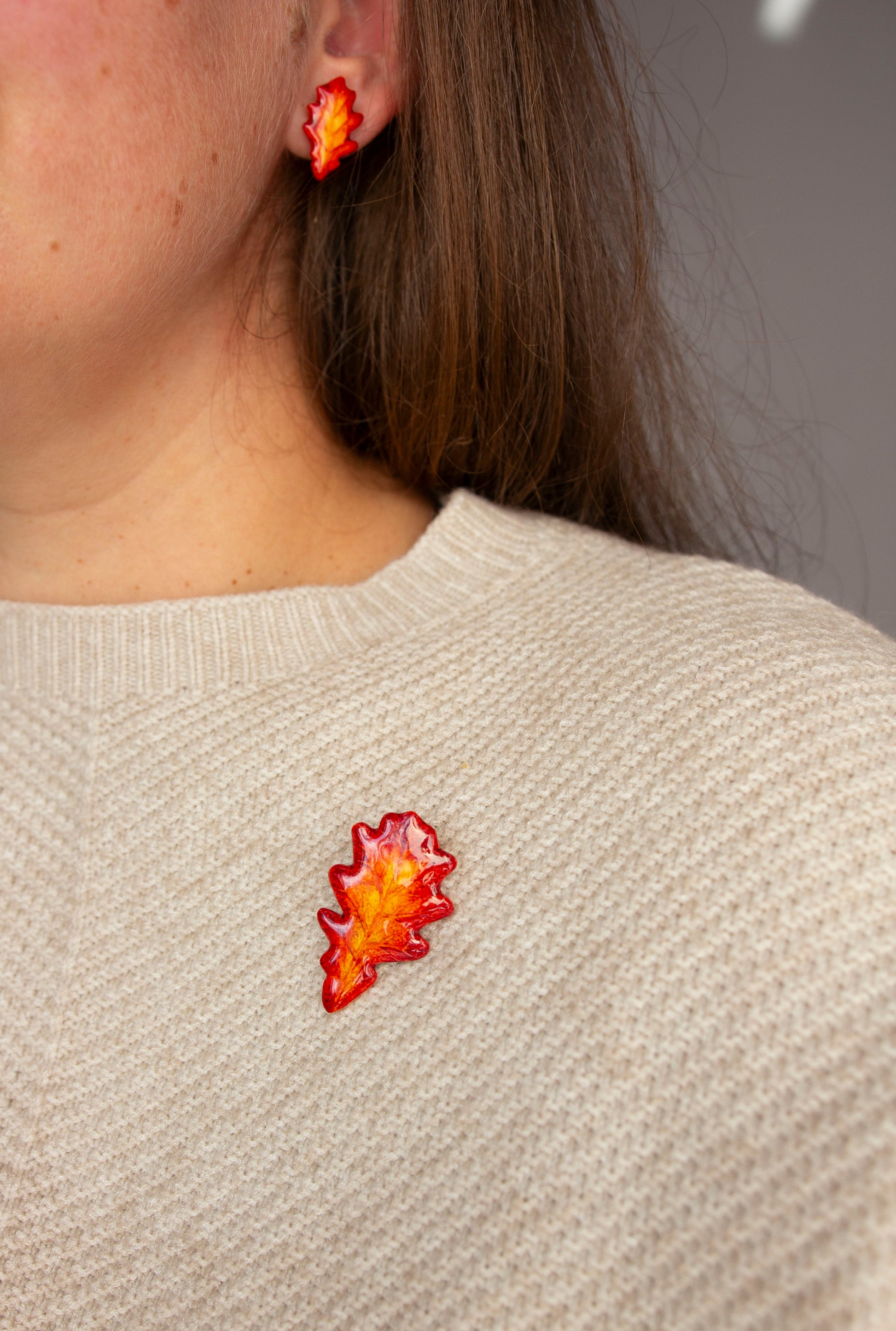 Ozollapas auskari un broša ir silts rudens akcents tiem, kas novērtē dabas skaistumu un dabiskumu. To košās rudens krāsas piešķir apģērbam dzīvīgumu un dzīvesprieku, savukārt ozollapa kā simbols ienes sajūtu par spēku un stabilitāti.